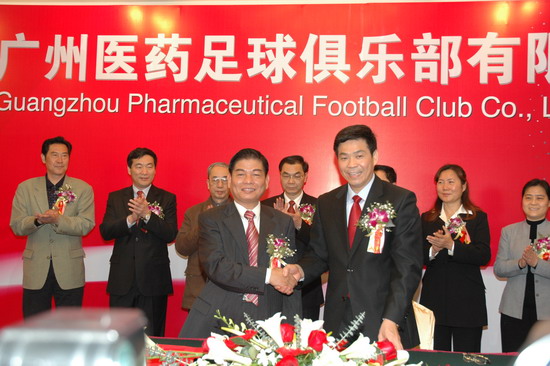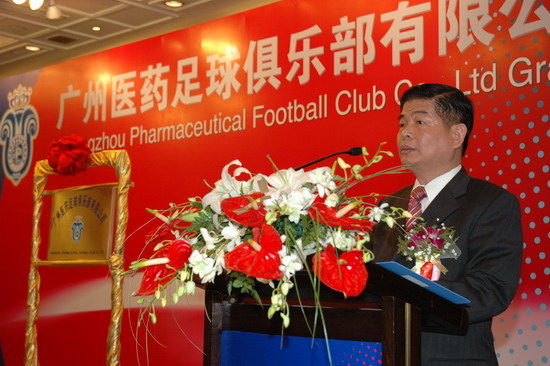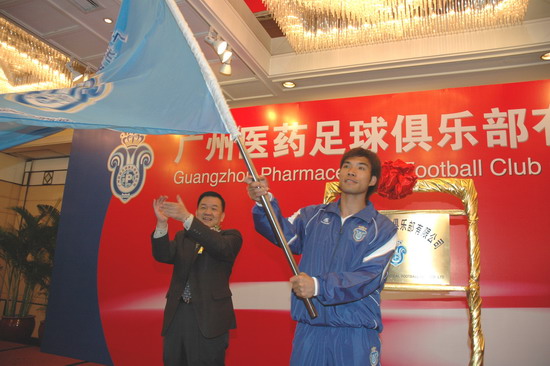 楊榮明董事長(zhǎng)認(rèn)為,廣藥與廣州足球的“聯(lián)姻”可以說是醫(yī)藥文化與足球文化的有機(jī)結(jié)合。足球運(yùn)動(dòng)本身與醫(yī)藥的追求始終都是為了健康,強(qiáng)強(qiáng)融合,勢(shì)不可擋。廣藥從經(jīng)營(yíng)角度而言,是實(shí)施品牌戰(zhàn)略需要。廣藥集團(tuán)作為廣州國(guó)企中龍頭企業(yè),經(jīng)濟(jì)實(shí)力雄厚,屬下20多家企業(yè)達(dá)數(shù)百個(gè)產(chǎn)品。去年廣藥集團(tuán)確定了立足廣東,“西進(jìn)、北上、東擴(kuò)”的新戰(zhàn)略。參與足球就是借足球這一全球影響力最大的項(xiàng)目,把廣藥推向全國(guó)以及國(guó)際。“我們注資足球是回饋社會(huì)的一種方式。廣藥這次“涉足”,不是贊助,而是投資——俱樂部注冊(cè)資金達(dá)2000萬元。我們?cè)谥Υ蛟熘袊?guó)制藥業(yè)的艦?zāi)傅耐瑫r(shí),也將全力打造足球這塊城市的名片”楊榮明解開了廣藥集團(tuán)參與足球之迷,顯然是動(dòng)真格的。當(dāng)天,廣藥足球隊(duì)全體將士身穿藍(lán)色(廣藥CI設(shè)計(jì)主色調(diào))隊(duì)服,讓人們眼前一亮,尤其隊(duì)徽,別有新意。“隊(duì)徽?qǐng)D案整體取廣州市木棉花的形狀;花托為一對(duì)羊角,隱喻羊城,花中心為廣藥LOGO,花蕊是皇冠,寓意廣州隊(duì)問鼎中國(guó)職業(yè)足球啊。在此,首先祝你們沖超成功”。楊榮明董事長(zhǎng)對(duì)在座的廣州足球運(yùn)動(dòng)將士興致勃勃地解說新隊(duì)徽,并給他們打氣。